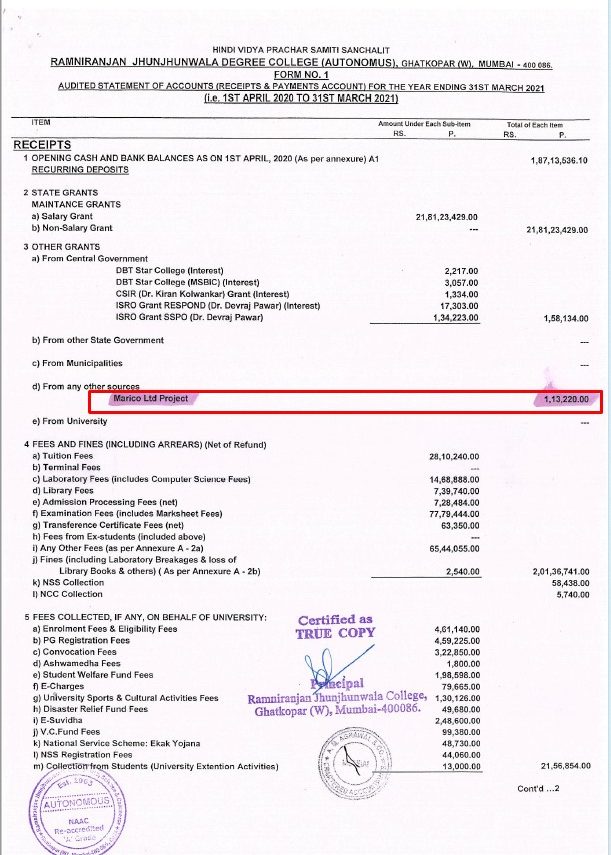 - 6.4.2 – Funds / Grants received from non-government bodies, individuals, and philanthropists during the year (not covered in Criterion III and V) (INR in lakhs) (2020-21)